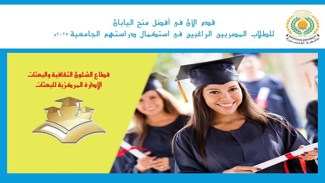 يُرجى من الطلاب التابعين لكليات جامعة المنصورة الراغبين في التقديم إرسال طلباتهم عبر البريد الإلكتروني قبل يوم 9 فبراير 2025، وذلك لإجراء عملية الاختيار المبدئي من قبل السفارة اليابانية.. تعد هذه المنحه فرصة فريدة لاستكمال تعليمك الجامعي في اليابان.