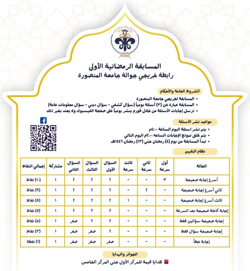 03 مارس,2025 eng. Walaa Yehia Hamouda 03 مارس 2025 المسابقة الرمضانية لخريجي جوالة جامعة المنصورة استعدوا لرحلة جديدة من المغامرة المسابقة الرمضانية لخريجي جوالة جامعة المنصورة الشروط والتفاصيل
