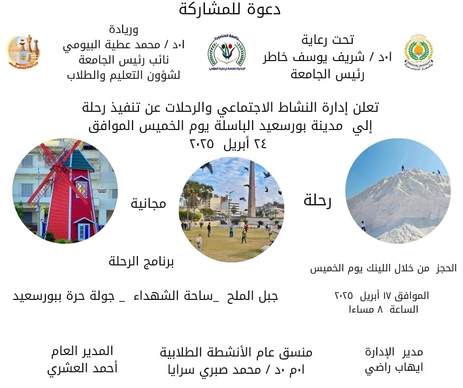 الإعلان عن تسجيل الإشتراك فى رحلة لمدينة بورسعيد الخميس 24 ابريل 2025 التسجيل بالرحله يبدأ غدا الجمعه الموافق ١٨ ابريل في تمام الساعه ٨ من خلال الرابط التالي https://docs.google.com/.../1FAIpQLScZhDmG1kD.../viewform...