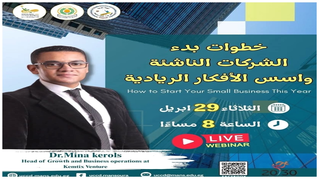 في إطار دعم جامعة المنصورة لنشر ثقافة ريادة الأعمال والعمل الحر بين طلابها وخريجيها، تُنظم مراكز التطوير المهني بالجامعة ندوة تدريبية جديدة بعنوان:"خطوات بدء الشركات الناشئة وأسس الأفكار الريادية"،وذلك برعاية الأستاذ الدكتور شريف يوسف خاطر، رئيس الجامعة، والأستاذ الدكتور محمد عطية البيومي، نائب رئيس الجامعة لشؤون التعليم والطلاب، وبإشراف الأستاذة الدكتورة منى أبو العز، المدير التنفيذي للمراكز، والدكتور طارق البهي، مدير وحدة ريادة الأعمال.