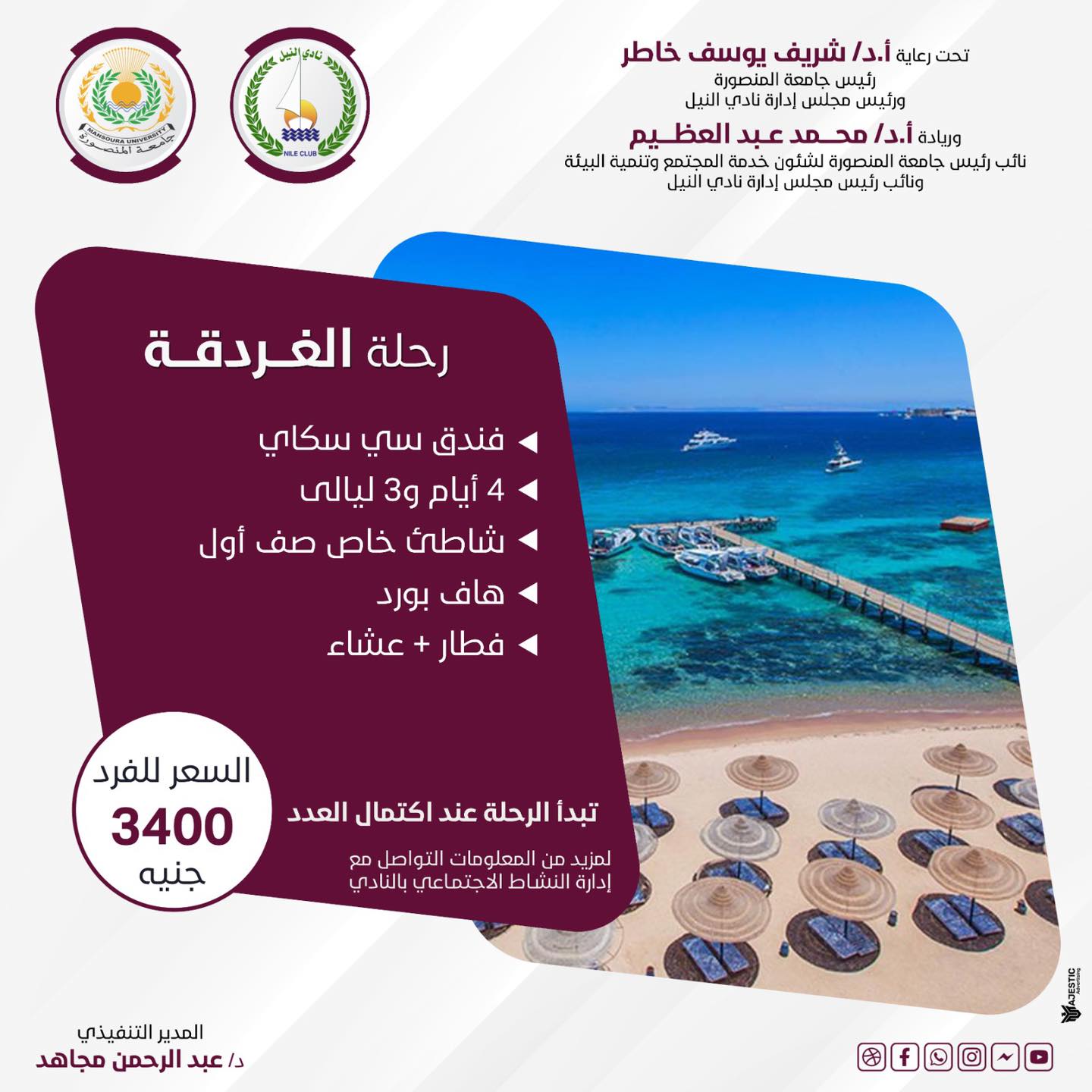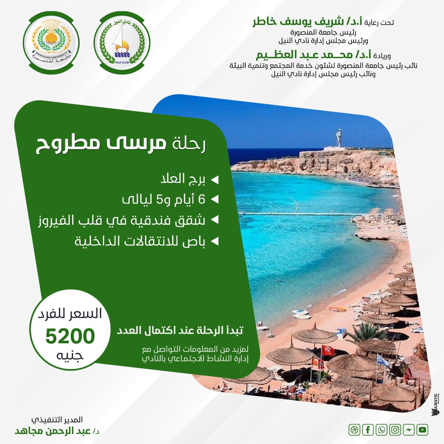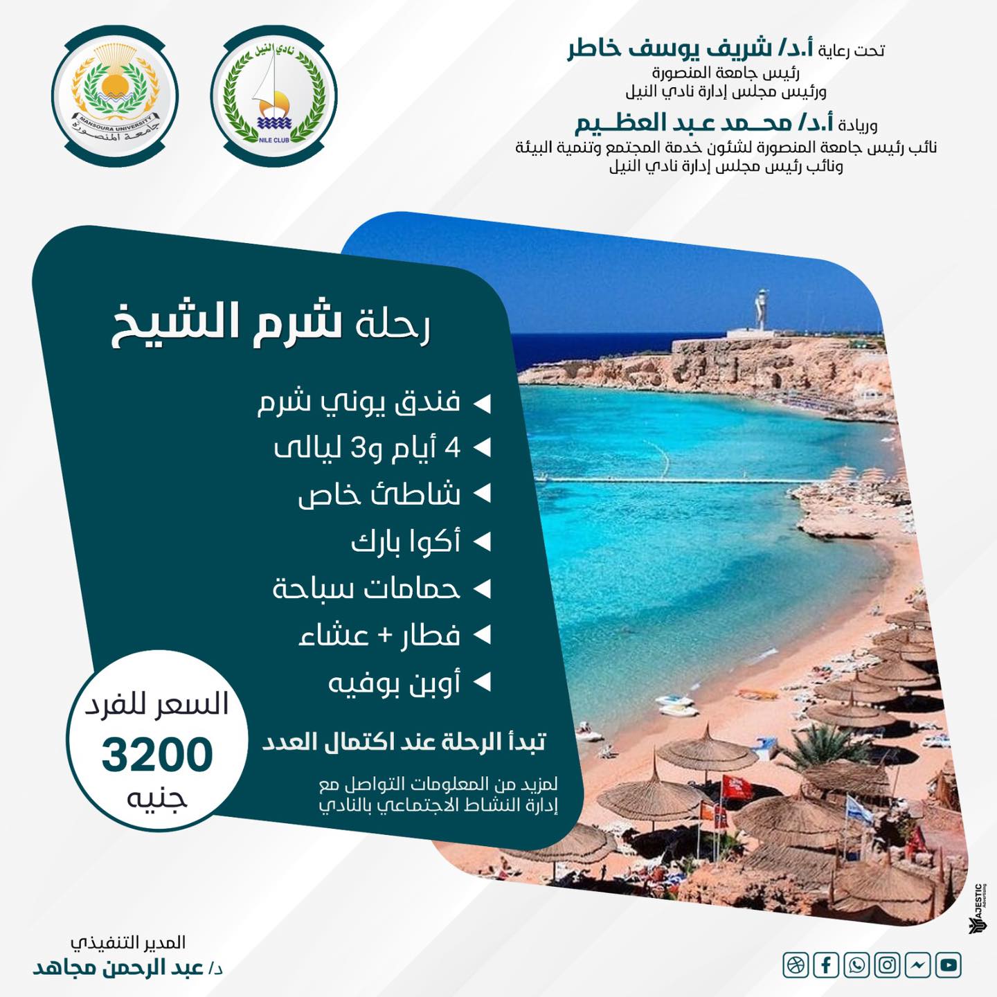 تحت رعايه معالي الوزير الاستاذ الدكتور / شريف خاطر .. رئيس جامعة المنصورة ، ورئيس مجلس إدارة نادي النيل .. والأستاذ الدكتور / محمد عبدالعظيم.. نائب رئيس الجامعة لشؤون خدمة المجتمع وتنمية البيئه .. ونائب رئيس مجلس إدارة نادي النيل