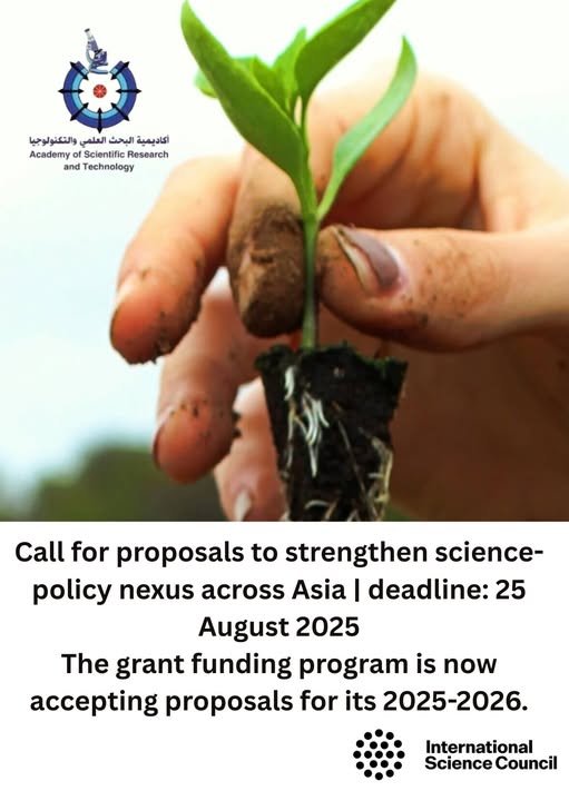 في إطار دعم التواصل بين المجتمع العلمي وصُنّاع القرار، تعلن أكاديمية البحث العلمي والتكنولوجيا عن فتح باب التقديم لبرنامج "بذور العلم – آسيا"، الذي أطلقته النقطة المحورية الإقليمية للعلوم في آسيا والمحيط الهادئ التابعة للمجلس الدولي للعلوم، بالتعاون مع الشبكة الدولية للمشورة العلمية الحكومية في آسيا.