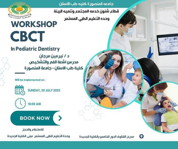 في إطار حرص جامعة المنصورة على دعم التطوير المهني المستمر، يعلن قطاع شئون خدمة المجتمع وتنمية البيئة بـكلية طب الأسنان – جامعة المنصورة، وبالتعاون مع قسم طب أسنان الأطفال وصحة الفم، وقسم طب الفم وأمراض اللثة والتشخيص والأشعة، عن تنظيم ورشة عمل متخصصة بعنوان: