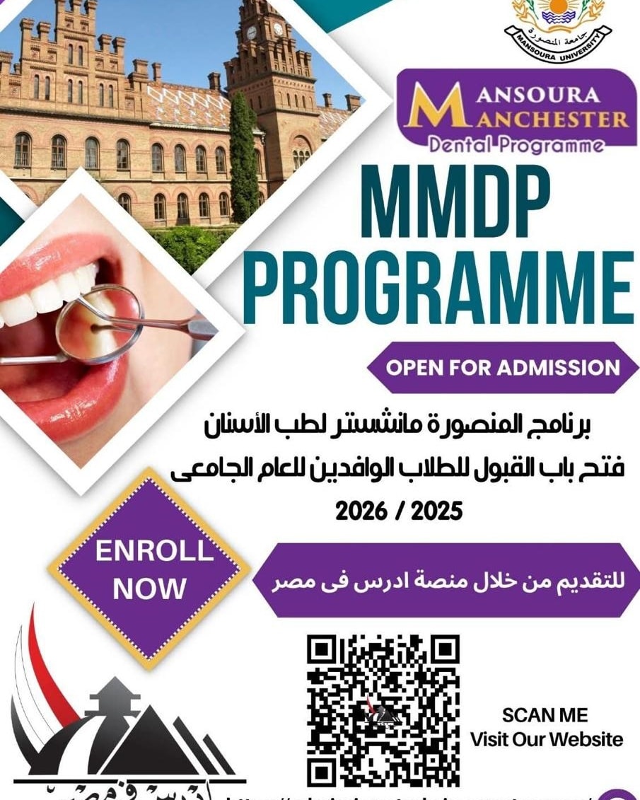 تعلن جامعة المنصورة عن فتح باب القبول ببرنامج MMDP – Mansoura Manchester Dental Programme للطلاب الوافدين للعام الجامعي 2025 / 2026 ![]()