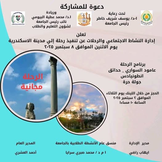 دعوة للإشتراك برحلة إلى مدينة الإسكدندرية الاثنين ٨ سبتمبر ٢٠٢٥
