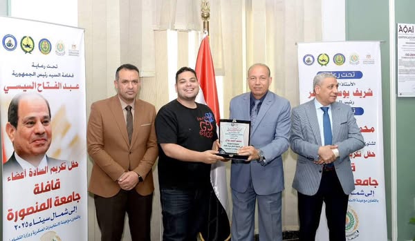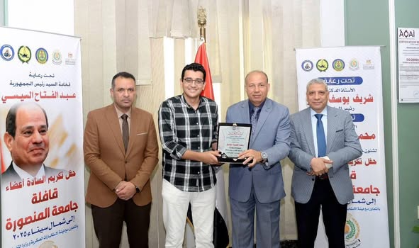 رئيس جامعة المنصورة يُكرِّم أعضاء قافلة “جسور الخير ٢٢” تقديرًا لعطائهم في شمال سيناء