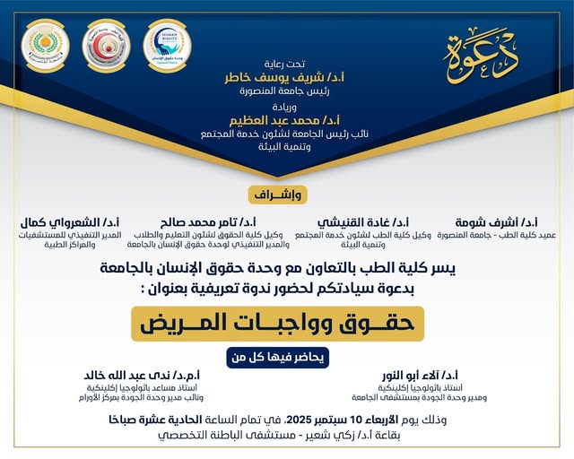 "حقوق وواجبات المريض"، والتي أُقيمت يوم الأربعاء الموافق *10 سبتمبر 2025* بكلية الطب - جامعة المنصورة ، بالتعاون مع *وحدة حقوق الإنسان بالجامعة*.