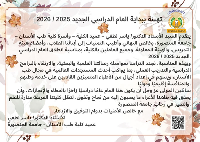 يتقدم السيد الأستاذ الدكتور/ ياسر لطفي – عميد الكلية – وأسرة كلية طب الأسنان – جامعة المنصورة، بخالص التهاني وأطيب التمنيات إلى أبنائنا الطلاب، وأعضاء هيئة التدريس، والهيئة المعاونة، وجميع العاملين بالكلية، بمناسبة انطلاق العام الدراسي الجديد 2025 / 2026.
