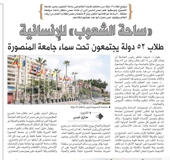 52 جنسية... لغة واحدة هي العلم، ومكان واحد هو جامعة المنصورة. 52 جنسية... لغة واحدة هي العلم، ومكان واحد هو جامعة المنصورة. جامعة المنصورة تُجسد رسالة مصر في بناء جسور المحبة والتنوع بين شعوب العالم. جريدة الأخبار الأربعاء 15 أكتوبر 2025
