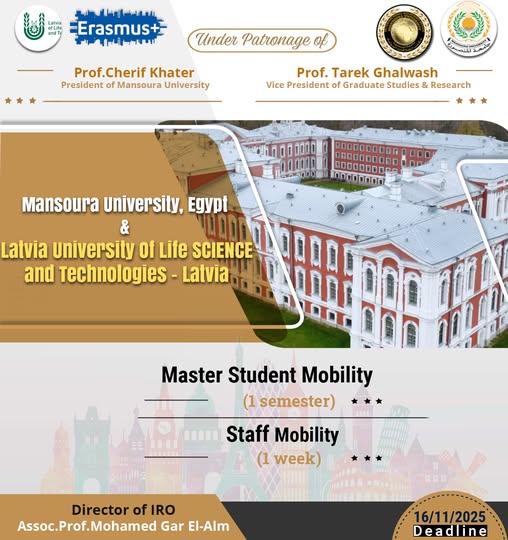 تحت رعاية ا.د/ شريف يوسف خاطر رئيس جامعة المنصورة و ريادة ا.د/ طارق غلوش نائب رئيس الجامعة للدراسات العليا والبحوث , يعلن مكتب العلاقات الدولية عن منحة خاصة بجامعة المنصورة لسفر طلاب الماجستير من الهيئة المعاونة بالجامعة لقضاء فصل دراسي (4 شهور) ومنحة لسفر السادة أعضاء هيئة التدريس بالجامعة لقضاء أسبوع بجامعة Latvia university of life Sciences and Technologies بدولة لاتفيا ممولة بالكامل من الاتحاد الأوروبي في إطار برنامج ايراسموس بلس
