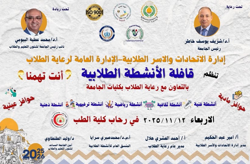11 نوفمبر,2025 eng. Walaa Yehia Hamouda 11 نوفمبر 2025 قافلة الأنشطة الطلابية بالتعاون مع رعاية الطلاب بكليات الجامعة