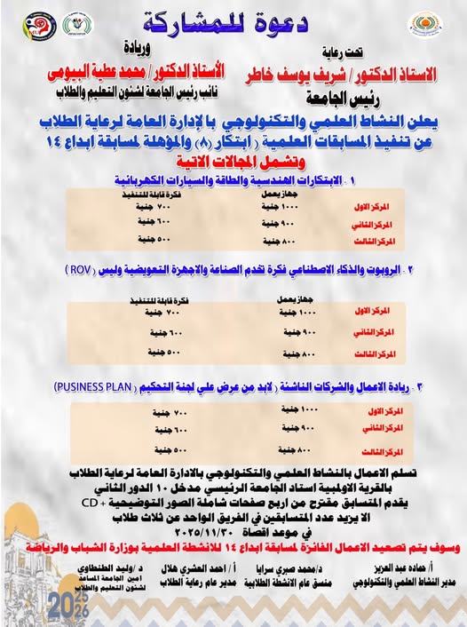 18 نوفمبر,2025 eng. Walaa Yehia Hamouda 18 نوفمبر 2025 دعوة للمشاركة… جامعة المنصورة تطلق موسم الابتكار 2025 بمسابقات علمية وجوائز كبرى لرواد المستقبل