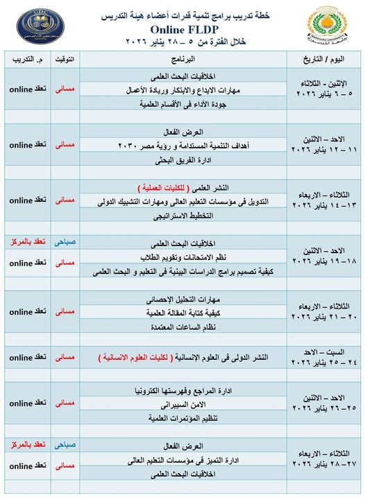 خطة Online FLDP برامج تدريب السادة أعضاء هيئة التدريس و السادة الباحثين فى الفترة من ٥ - ٢٨ يناير ٢٠٢٦
