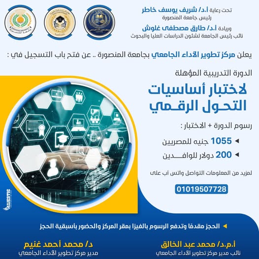 06 يناير,2026 eng. Walaa Yehia Hamouda 06 يناير 2026 فتح باب التسجيل في الدورة التدريبية المؤهلة لاختبار اساسيات التحول الرقمي يعلن #مركز_تطوير_الأداء_الجامعي عن فتح باب التسجيل في الدورة التدريبية المؤهلة لاختبار اساسيات التحول الرقمي #اختبار_التحول_الرقمي #جامعة_المنصورة