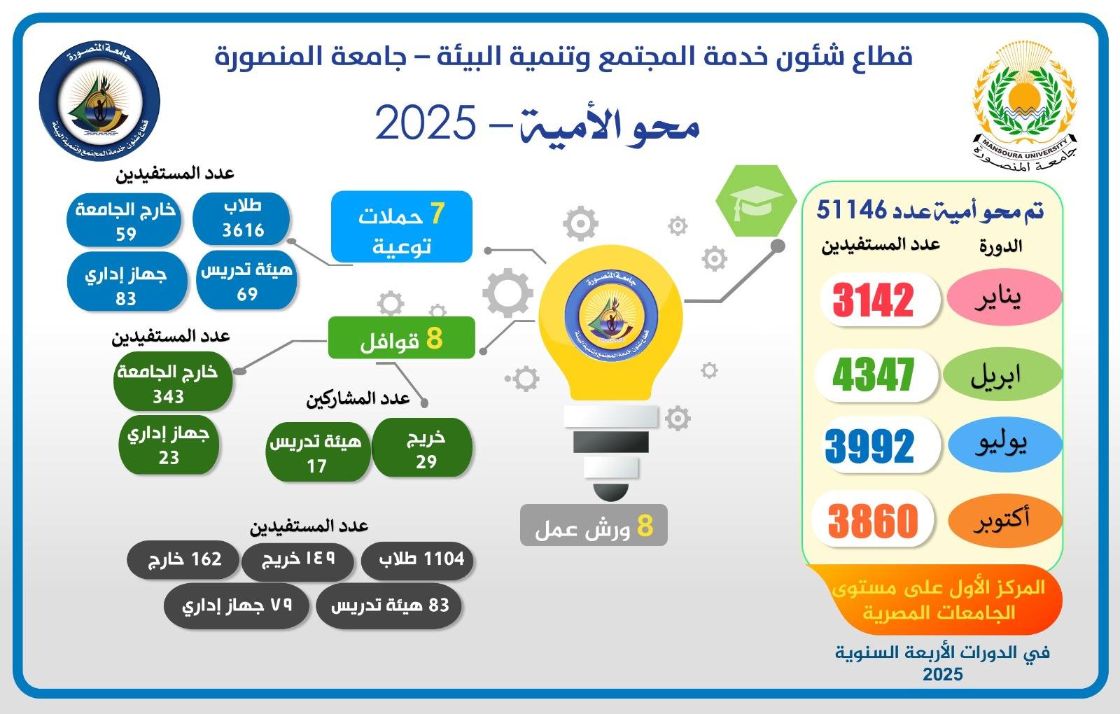 وفي ملف محو الأمية، واصلت جامعة المنصورة تصدُّرها للجامعات المصرية خلال أربع دورات متتالية للهيئة العامة لتعليم الكبار، حيث تم محو أمية ما يقرب من سبعة عشر ألف دارس خلال عام 2025، إلى جانب تنفيذ حملات توعوية، وقوافل، وورش عمل، دعمًا لبرامج التمكين المعرفي ونشر الثقافة التعليمية.
