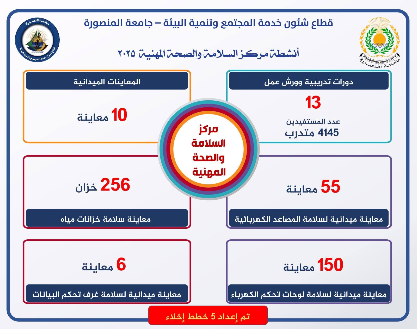 وفي مجال السلامة والصحة المهنية، نفذ مركز السلامة والصحة المهنية عددًا كبيرًا من الدورات التدريبية وورش العمل، إلى جانب تنفيذ معاينات دورية لمنشآت الجامعة، وخزانات المياه، والمصاعد، ولوحات التحكم، وغرف البيانات، فضلًا عن إعداد خطط إخلاء لتعزيز جاهزية المنشآت الجامعية لمواجهة الطوارئ.