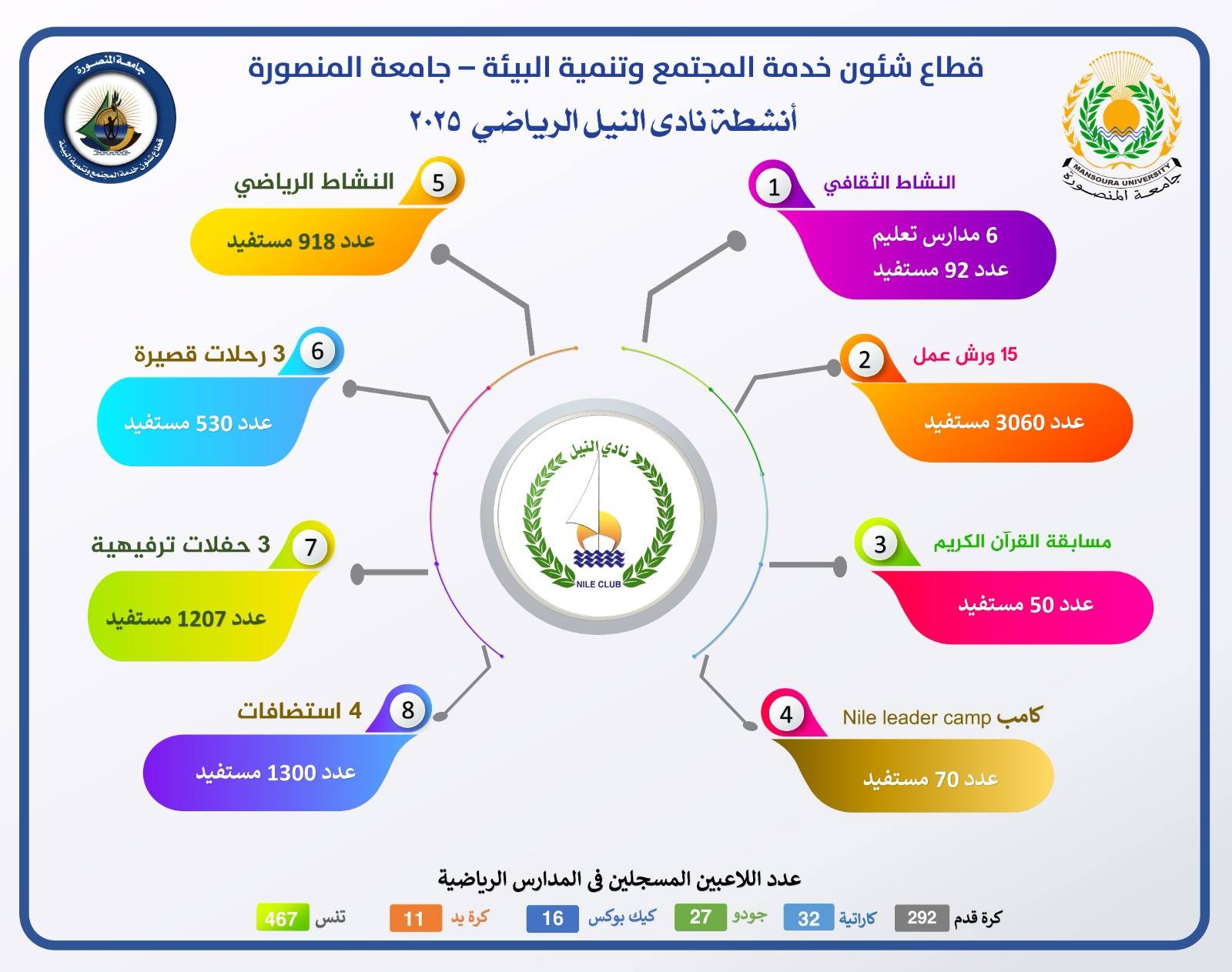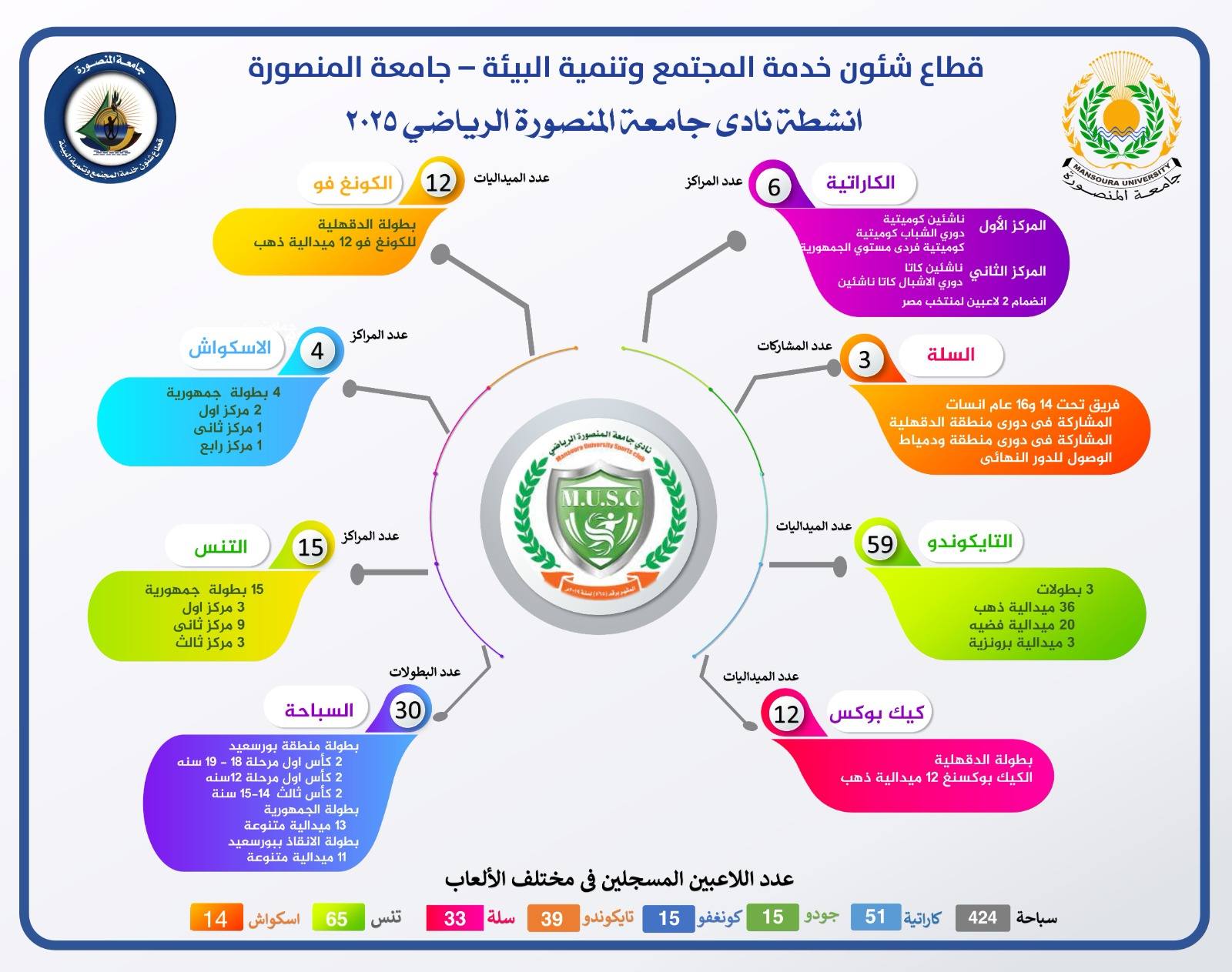 وسلَّط التقرير الضوء على الطفرة التي شهدها نادي جامعة المنصورة الرياضي في مختلف البطولات الجمهورية، حيث حققت الفرق الرياضية بالجامعة مراكز متقدمة وميداليات متنوعة في عدد من الألعاب الفردية والجماعية، ليصل عدد اللاعبين المسجلين في مختلف الألعاب إلى مئات اللاعبين.