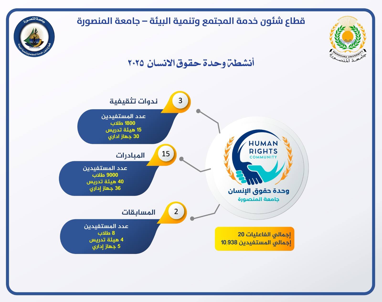 كما نفذت وحدة حقوق الإنسان عددًا كبيرًا من الفعاليات المتنوعة خلال عام 2025، استفاد منها آلاف الطلاب وأعضاء هيئة التدريس والعاملين، بما يسهم في ترسيخ ثقافة حقوق الإنسان وقيم المواطنة داخل المجتمع الجامعي.