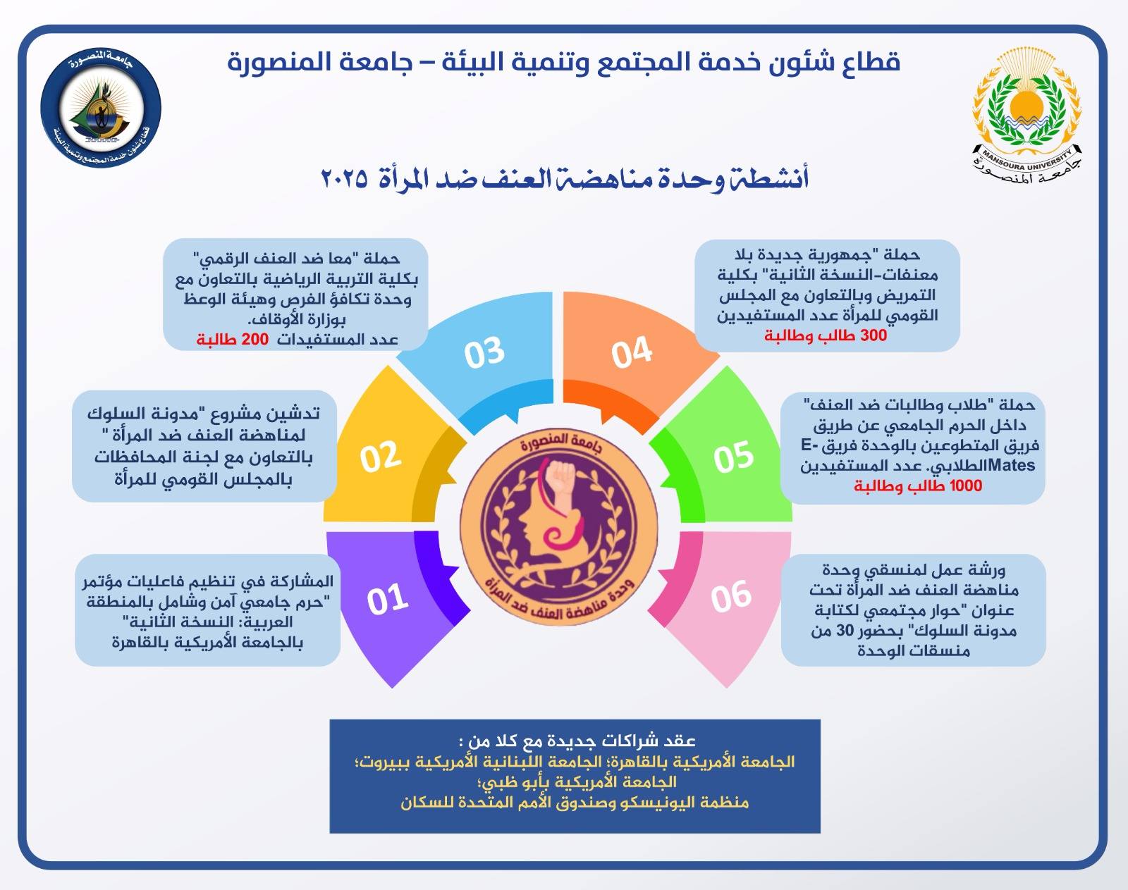 وتناول التقرير جهود وحدة مناهضة العنف ضد المرأة في تعزيز بيئة جامعية آمنة، من خلال تنفيذ عدد من الحملات التوعوية داخل الكليات والحرم الجامعي، وتدشين مشروع «مدونة السلوك لمناهضة العنف ضد المرأة»، والمشاركة في تنظيم مؤتمر «حرم جامعي آمن وشامل في المنطقة العربية»، إلى جانب تنفيذ ورش عمل، وعقد شراكات مع جامعات إقليمية ودولية ومنظمات دولية.