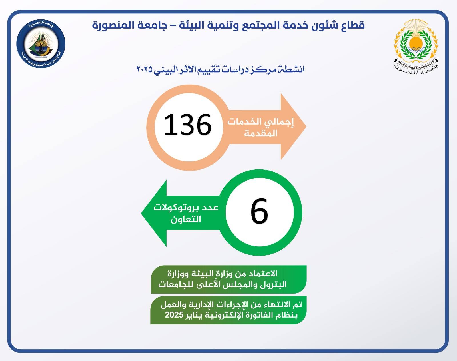 كما واصل مركز دراسات وتقييم الأثر البيئي أداءه المتقدم في دعم مشروعات التنمية المستدامة، من خلال تقديم عشرات الخدمات المتخصصة، وتفعيل بروتوكولات تعاون متعددة، والحصول على الاعتماد من وزارة البيئة ووزارة البترول والمجلس الأعلى للجامعات، إلى جانب تطبيق نظام الفاتورة الإلكترونية في يناير 2025، بما يعزز حوكمة الأداء المالي والإداري.