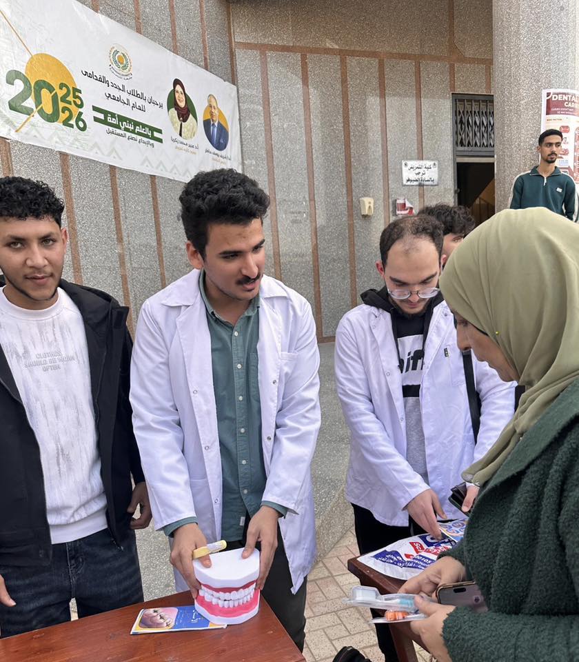 وقد بدأت يوم الاثنين الموافق ١٦ فبراير ٢٠٢٦ الفاعلية الاولي من فاعليات السلسلة التوعوية والخدمية والتي تقدمها كليه طب الاسنان لطلاب الجامعة في مختلف الكليات بعمل قافلتين الي كليتي التجارة والتمريض
