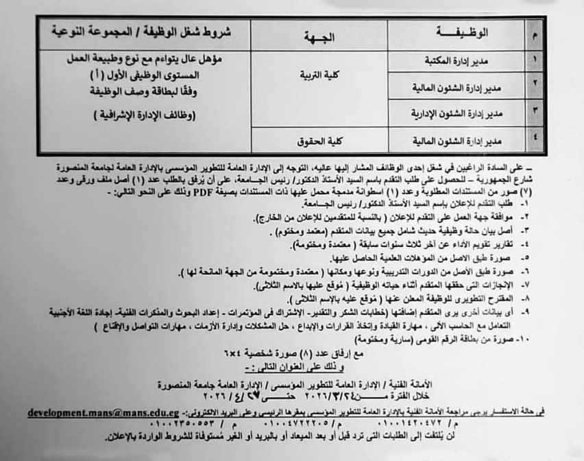 إعلان جامعة المنصورة بتاريخ ٢٤ مارس ٢٠٢٦ عن حاجتها لشغل بعض الوظائف الإشرافية