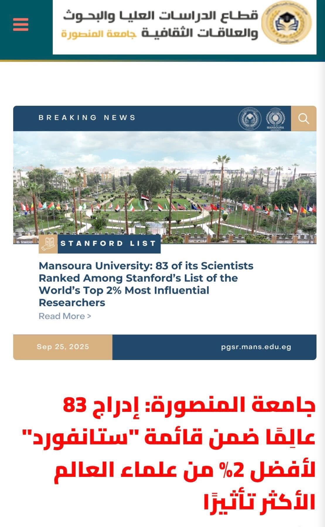 أعلن مجلس جامعة المنصورة، برئاسة الأستاذ الدكتور شريف خاطر، رئيس الجامعة، خلال جلسته رقم (628) المنعقدة يوم الاثنين الموافق 22 سبتمبر 2025، وبحضور اللواء طارق مرزوق، محافظ الدقهلية، عن أسماء الفائزين بجوائز الجامعة للعام 2025؛ حيث فاز 52 عضوًا من أعضاء هيئة التدريس والهيئة المعاونة من إجمالي 104 متقدمين.