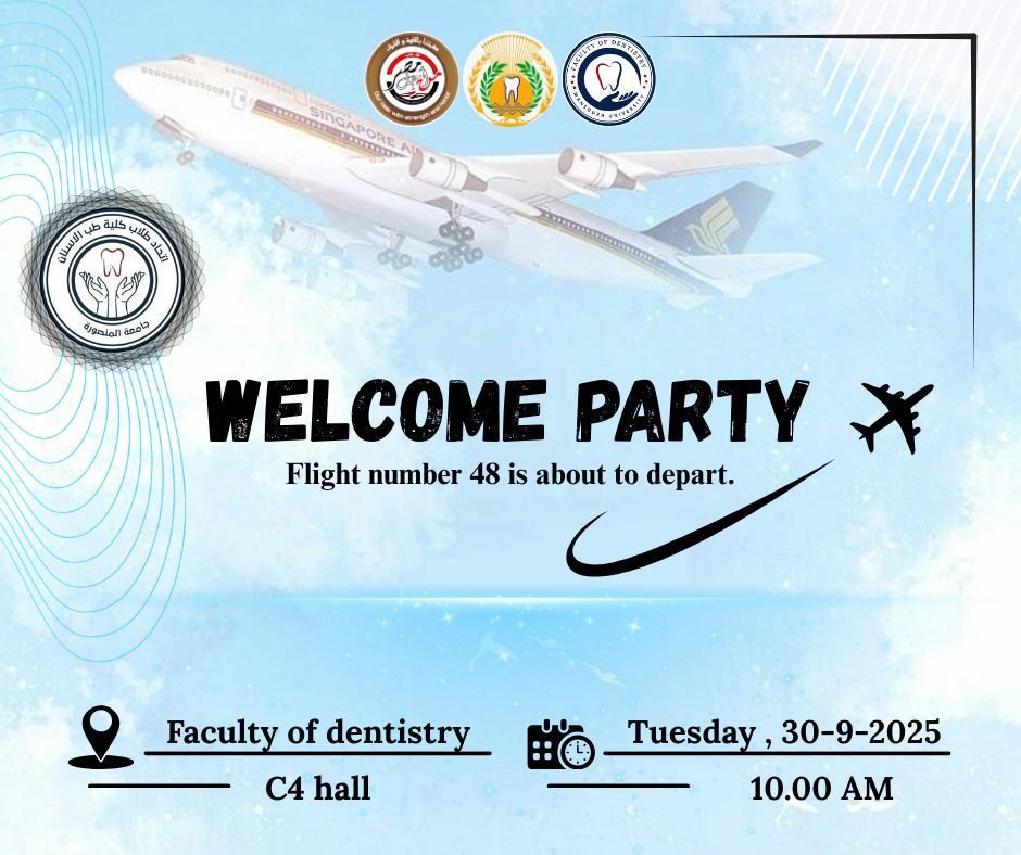 تتشرف كلية طب الأسنان – جامعة المنصورة بدعوة أبنائها الطلاب الجدد "دفعة 48" لحضور **الحفل الرسمي لاستقبال الطلاب الجدد**، والمقرر إقامته يوم **الثلاثاء الموافق 30 سبتمبر 2025، في تمام الساعة العاشرة صباحًا، بقاعة C4 بالدور الأول علوي بمبنى C.