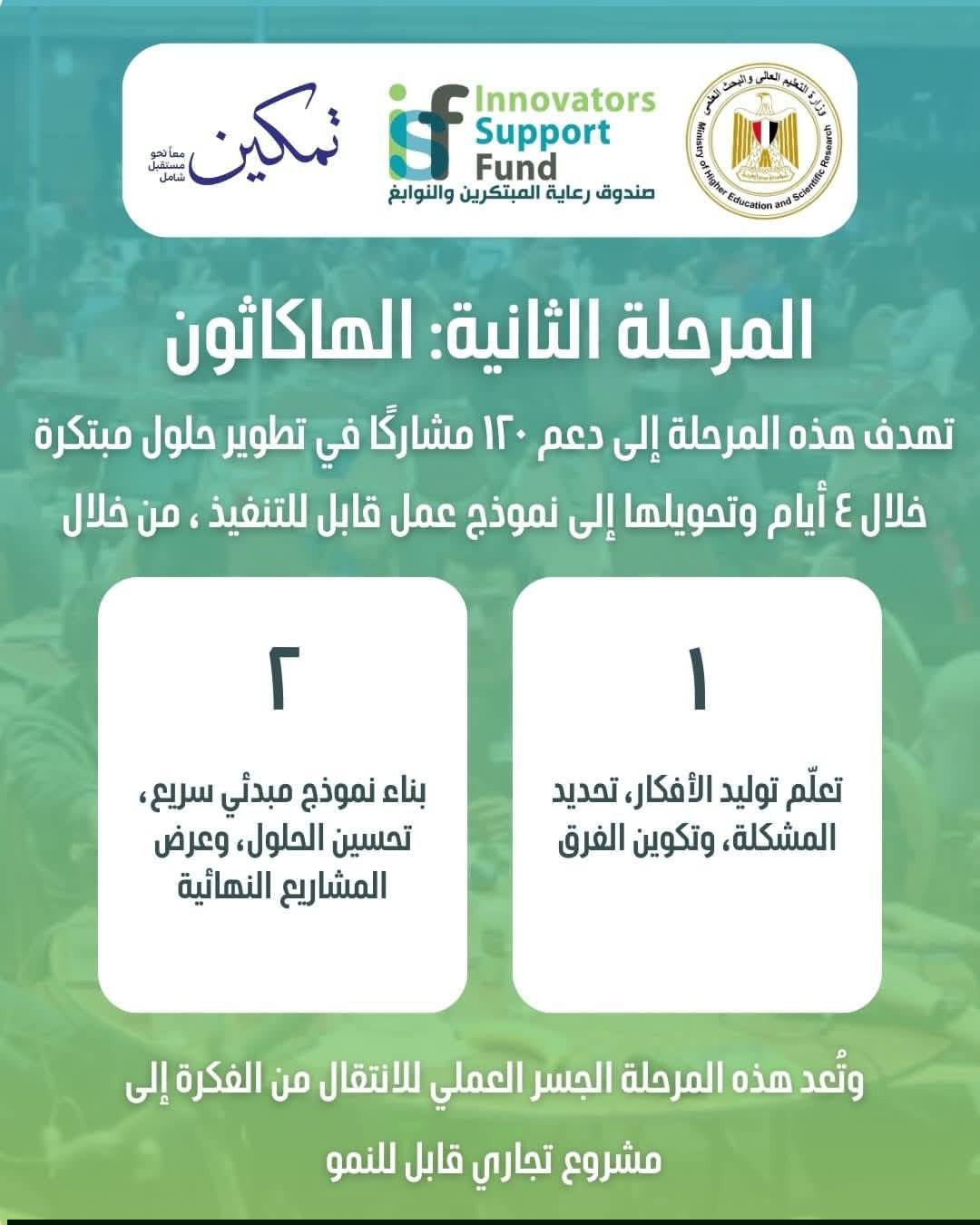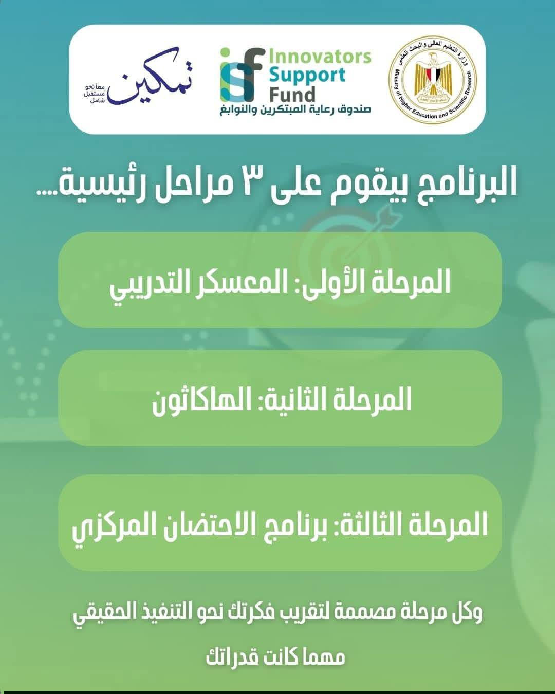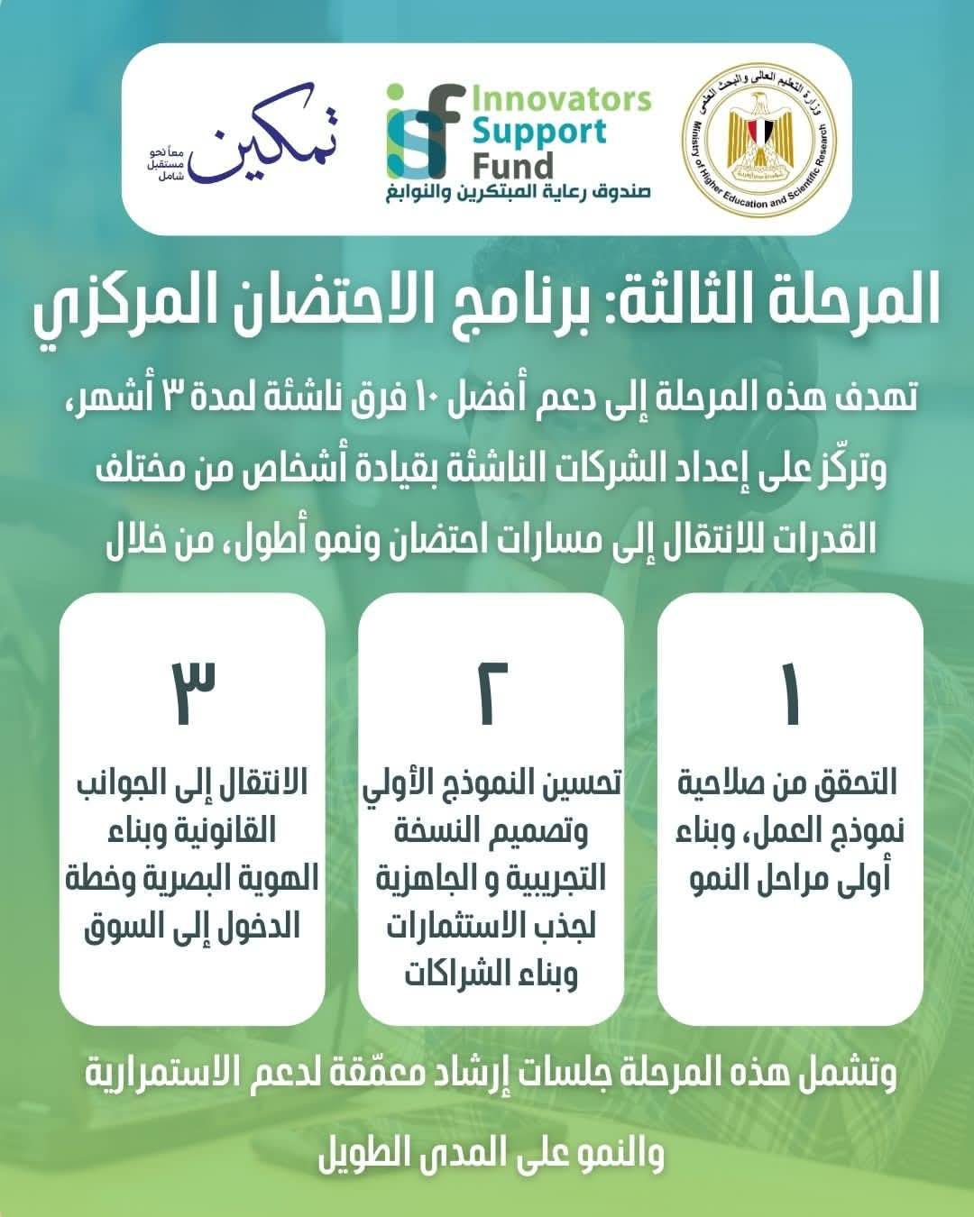 ودعم تقني وتجاري وقانوني، بالشراكة بين وزارة التعليم العالي وصندوق رعاية المبتكرين والنوابغ ووحدة تمكين، وبالتنفيذ من شركة ALX المتخصصة في الابتكار وريادة الأعمال على مستوى إفريقيا، ويستهدف البرنامج 150 رائدًا ورائدة أعمال.