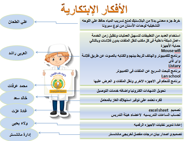 أعربت إدارة كلية طب الأسنان – جامعة المنصورة عن خالص امتنانها وتقديرها لمجموعة من الموظفين الذين قدموا أفكارًا ابتكارية ساهمت في تحسين بيئة العمل، ورفع كفاءة الأداء الإداري، وتحقيق وفورات زمنية ومادية تخدم مصلحة الكلية ومنتسبيها.