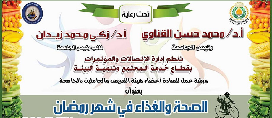 يعلن قطاع خدمة المجتمع وتنمية البيئة عن ورشة عمل " الصحة والغذاء في رمضان " يحاضر فيها مجموعة متخصصة في هذا المجال والتي تنظمها ادارة الاتصالات والمؤتمرات خلال الفترة من 12 -13 يونيو 2016 للسادة