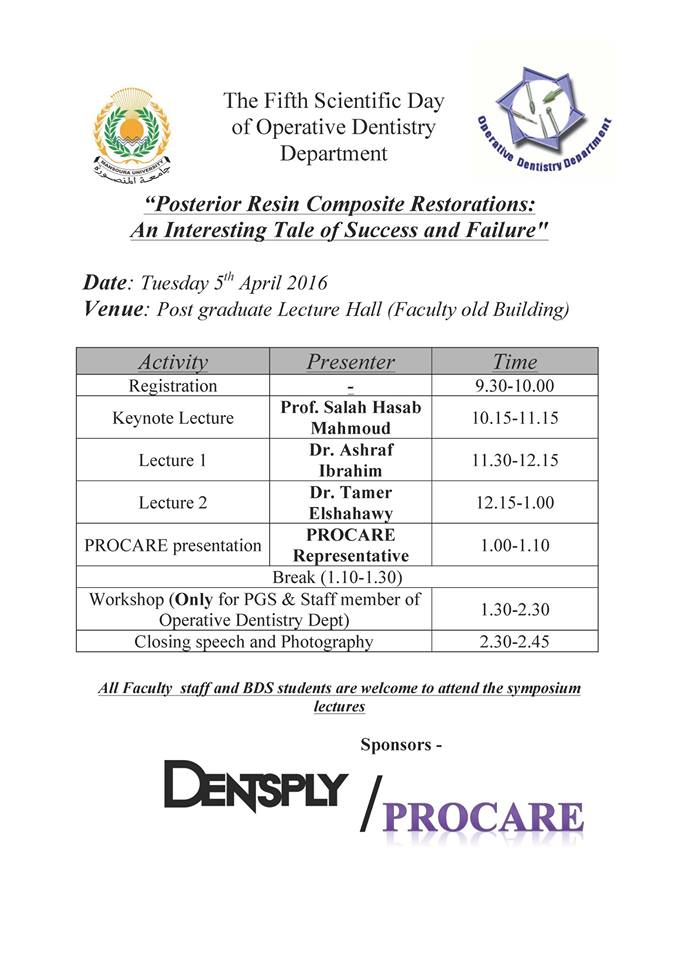 تم إقامة يوم الثلاثاء الموافق ٥-٤-٢٠١٦ ندوه علميه بعنوان " Posterior Resin Composite Restorations: An Interesting Tale of Success and Failure" و التي