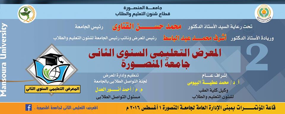 حيث تعرض جامعة المنصورة 15 برنامج متميز لطلاب الثانوية العامة بالمعرض التعليمى الثانى غدا الاثنين الاول من أغسطس والذى ينظمه قطاع التعليم والطلاب بقاعة المؤتمرات بادارة الجامعة تحت رعاية السيد أ.د/محمد حسن القناوى رئيس جامعة المنصورة واشراف الدكتور محمد عطية وكيل كلية الطب للتعليم والطلاب والدكتور احمد العدل مسئول التواصل الطلابى وتنظيم المعرض