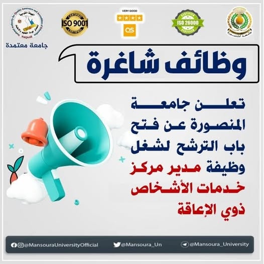 تعلن جامعة المنصورة عن فتح باب الترشح لشغل وظيفة مدير مركز خدمات الأشخاص ذوي الإعاقة ، لمعرفة الشروط المطلوبة ، المستندات المطلوبة على الرابط التالى :